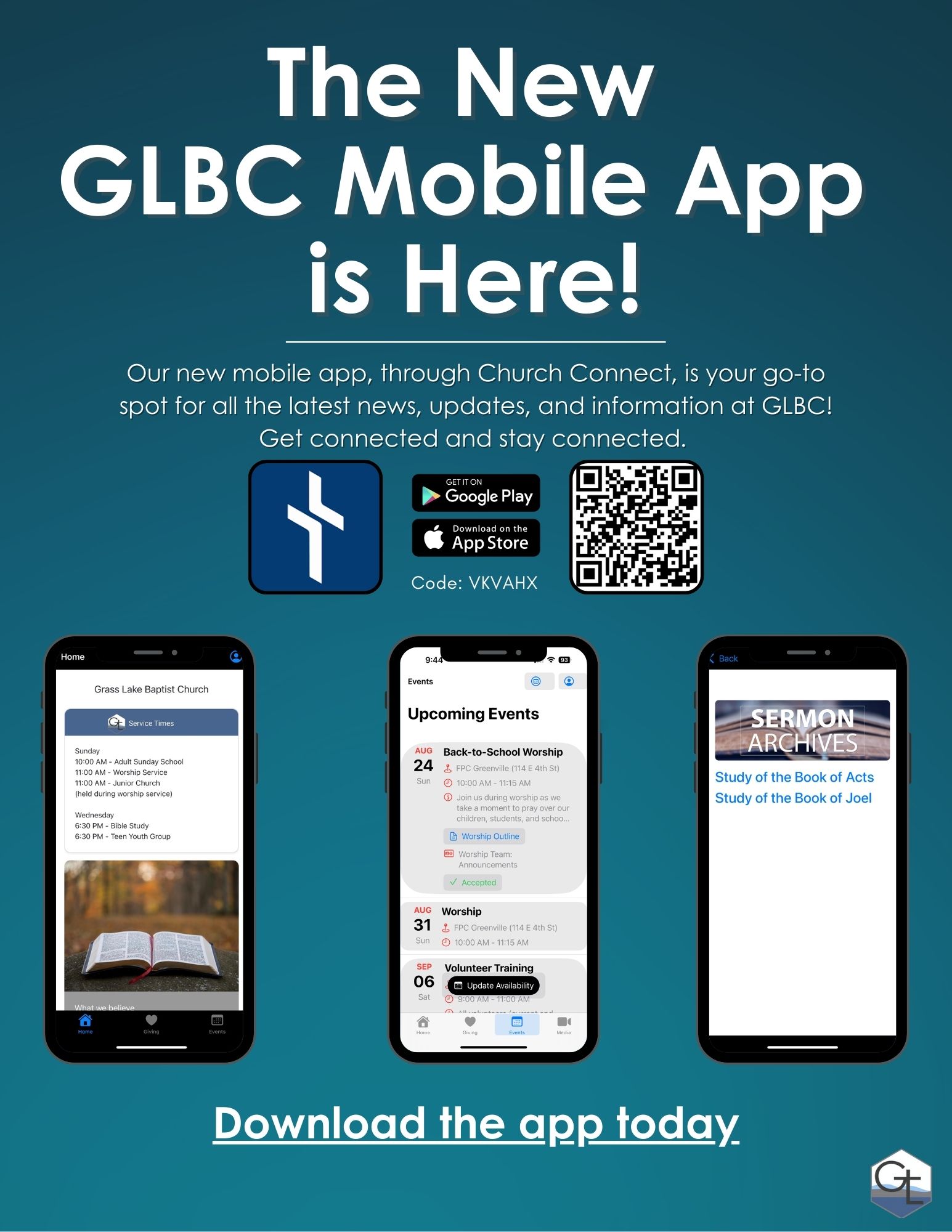 The new mobile app works on both Android and iOS phones. Just scan the QR code. Once it has downloaded, it will ask you to verify Grass Lake Baptist Church is church you want to connect to. It's that easy!